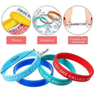 Strap on a cool and colorful branded promotion with these silicone wristbands. A budget-friendly way to connect with your customers and supporters at conventions, trade shows, grand openings, product launches and more.Available in 8" x .5" x .1", 7" x .5" x .1" and 6" x .5" x .1" sizes to fit everyone from kids to adults.Custom sizes can be created upon request. Choose a shade and select from our embossed, debossed, color filled or print options.Add your school, sports team, organizational or company logo or message.