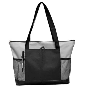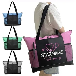 Feather Flight Zippered Tote Bag is an extra large zippered tote bag that features 80GSM non-woven polypropylene, dual 26" carrying handles, 3 exterior mesh pouches and is recyclable & reusable.