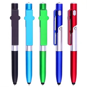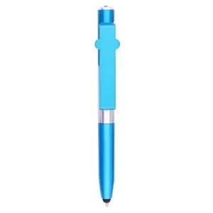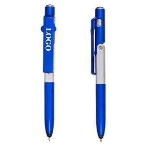 This multi-function twist-action ballpoint pen has a bright LED flashlight on the top, a capacitive stylus on the tip, and a hinge that forms as a cell phone stand, 4 In 1 Folding Pen With Stylus, Torch And Mobile Stand.